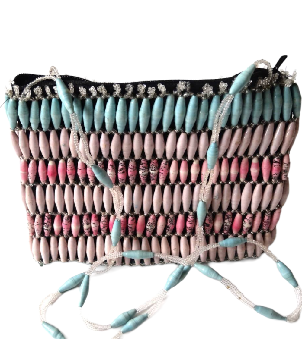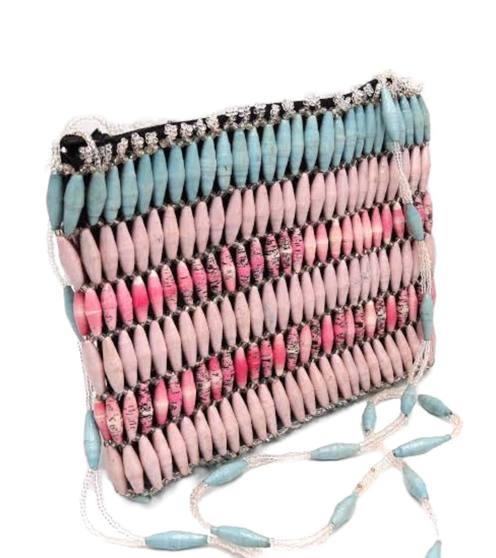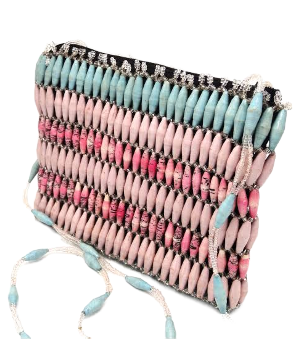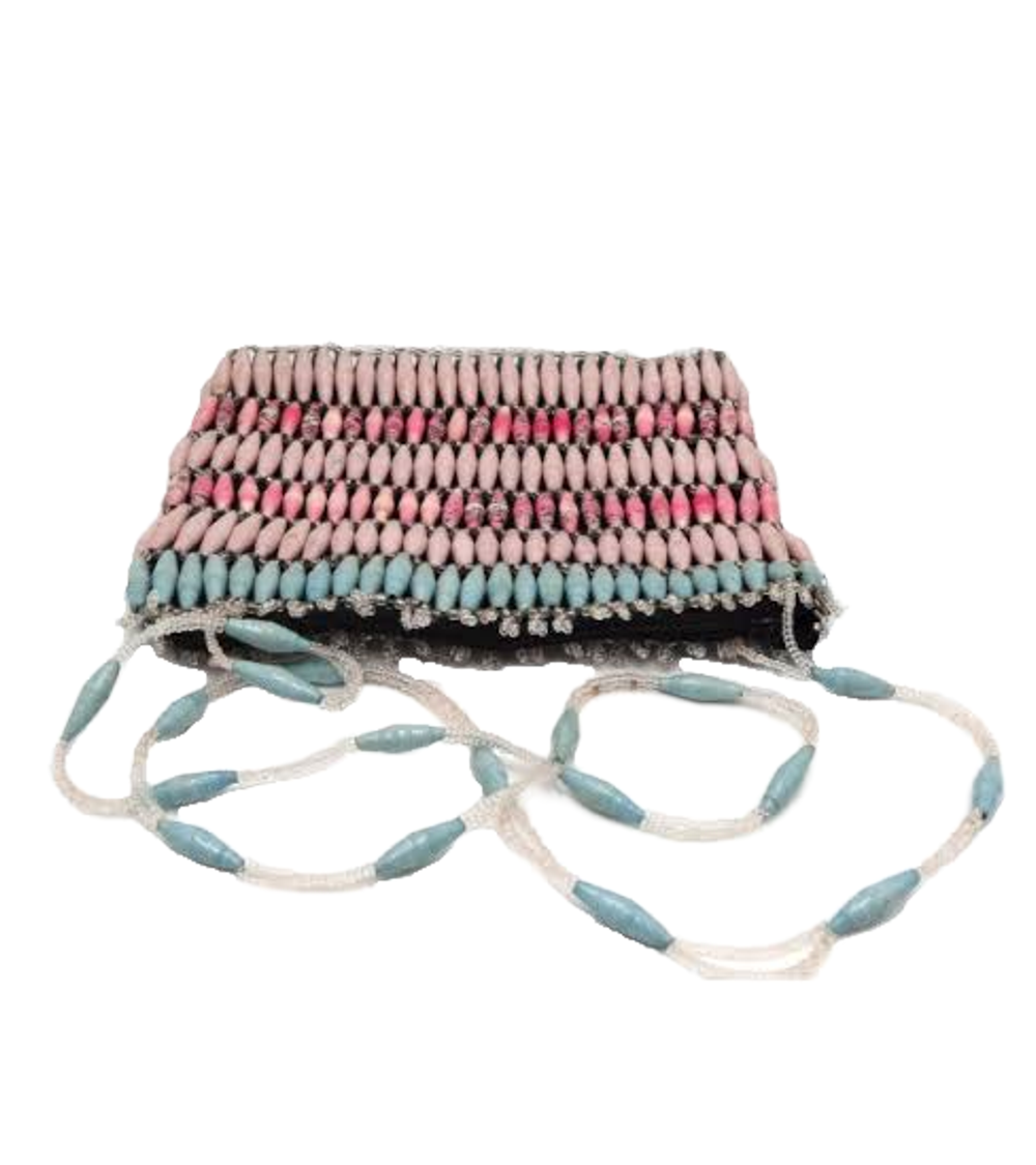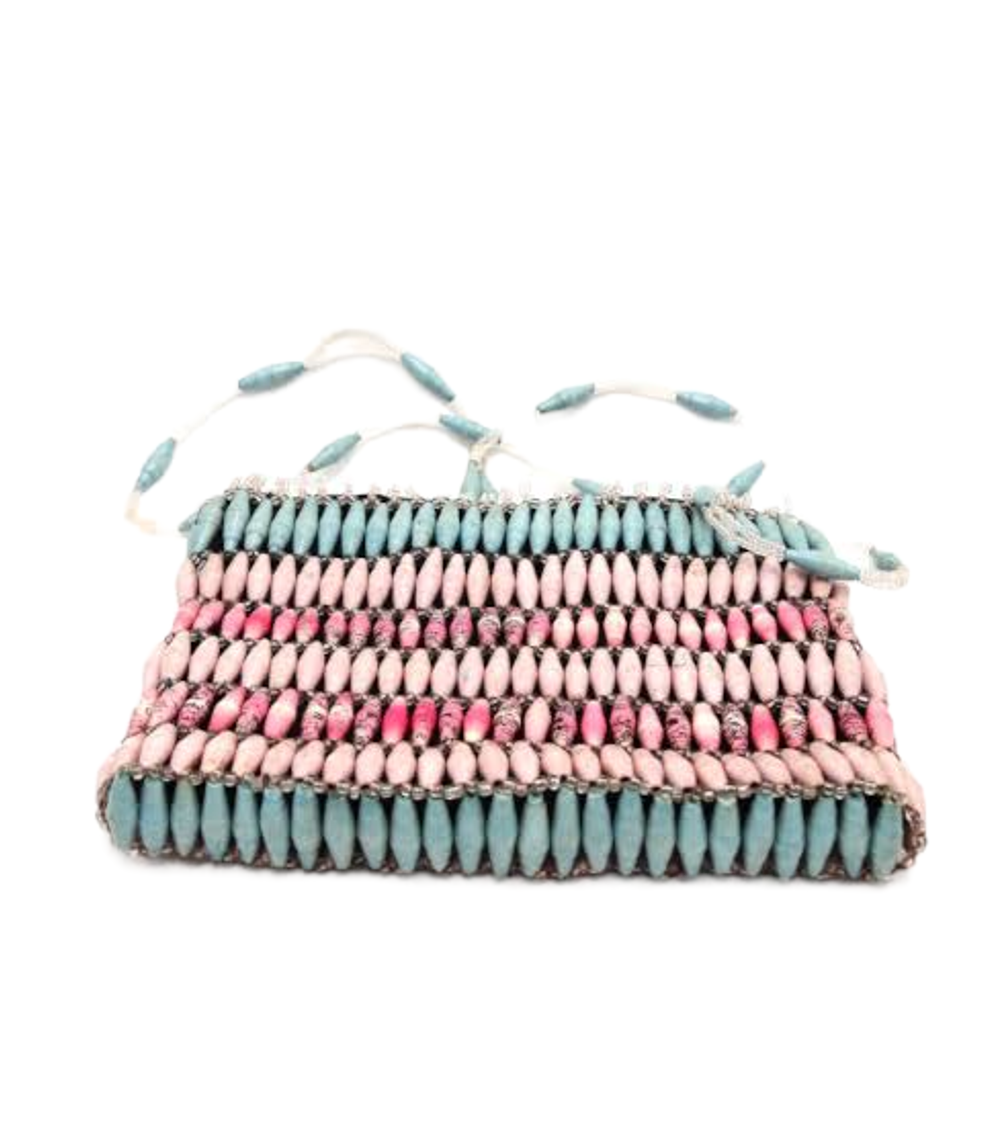 This beaded Angelic Pink blue bead bag purse is a unique one of a kind design from recycled paper with each bead carefully rolled and varnished. Carefully designed hand rolled beads strung into patterns with interlinking glass beads to create a singularly unique purse.