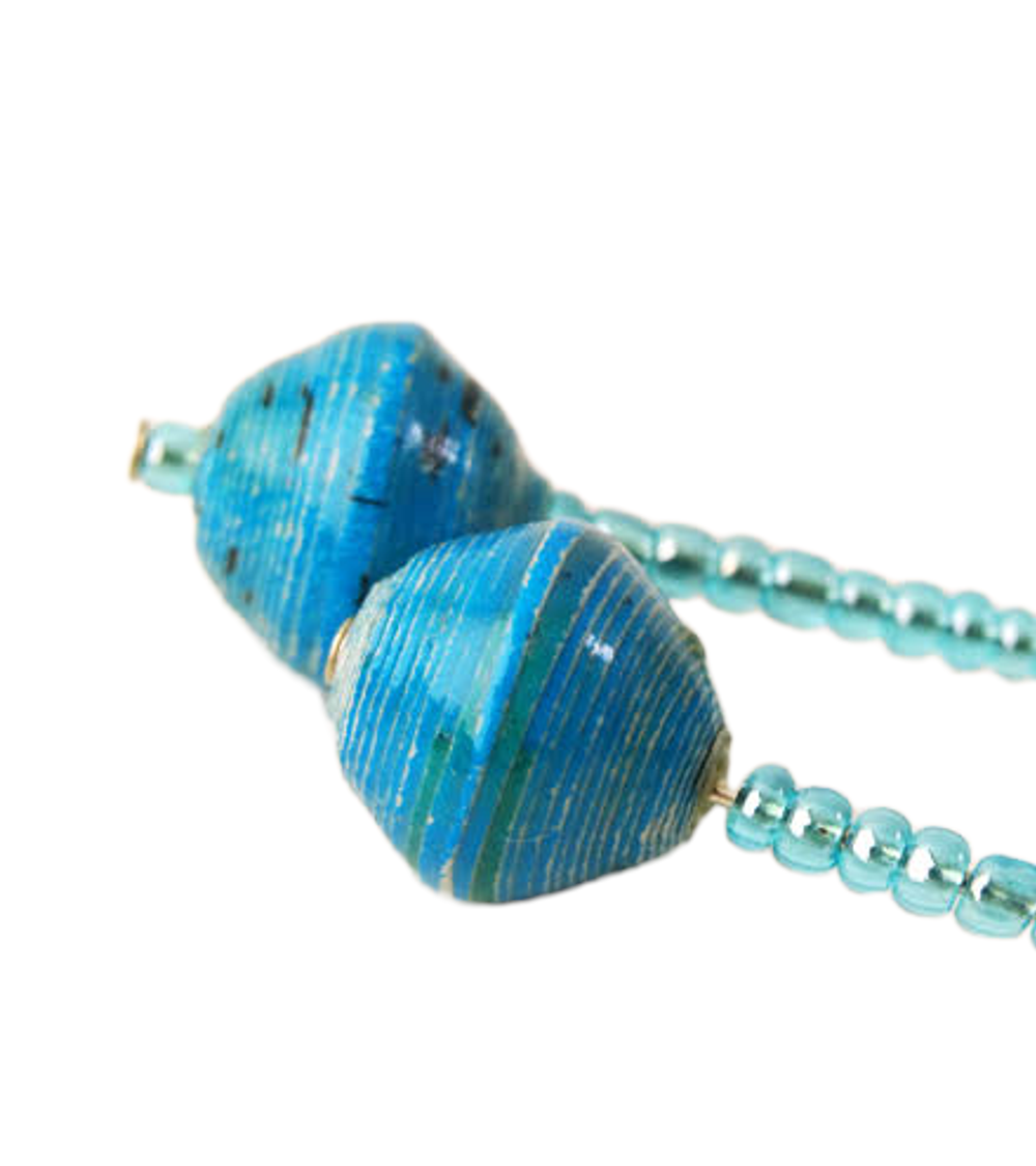 Buy these lovely little colourful pair of handmade blue design bead earrings. Because each bead is individually hand-drawn in a unique one of a kind design from recycled paper.